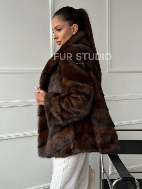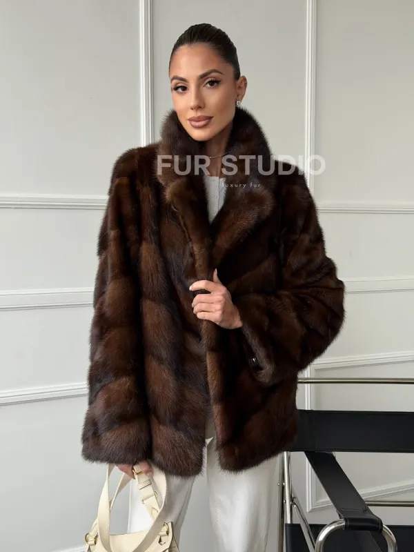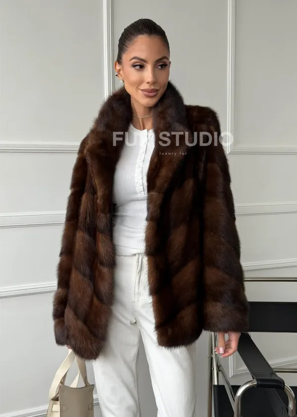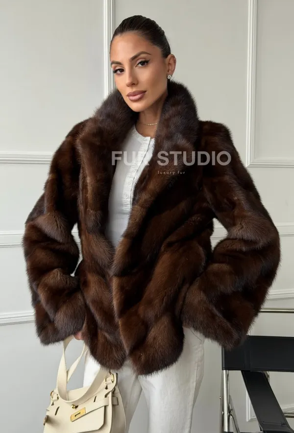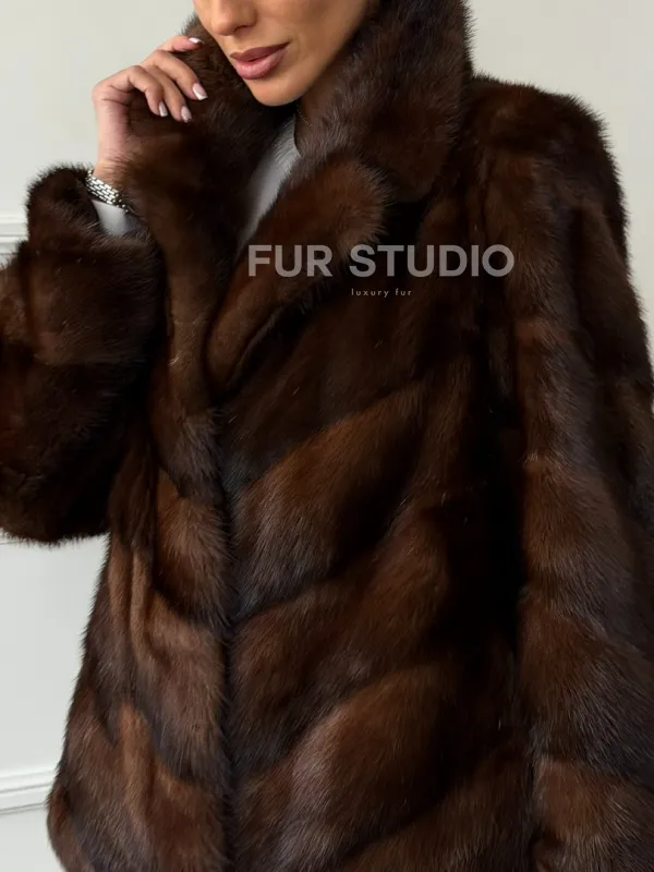Мех данной шубы аукционная норка , цвет коричневый. Предлагается в размерах от 42 до 50. Длина модели 65-70 см, что выгодно подчеркивает фигуру девушек. Эта модель идеально подойдет для девушек и женщин, предпочитающих роскошные натуральные меха.