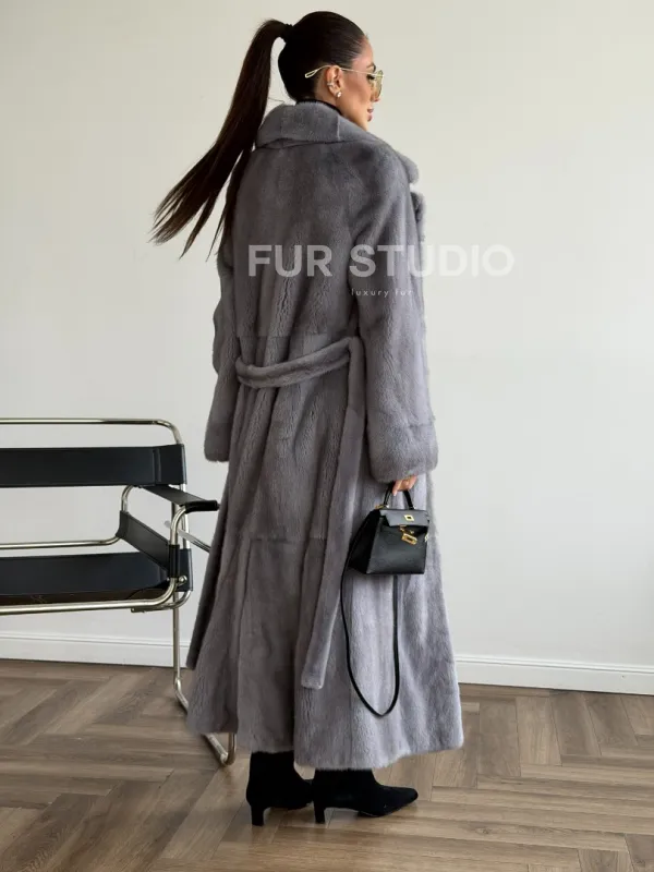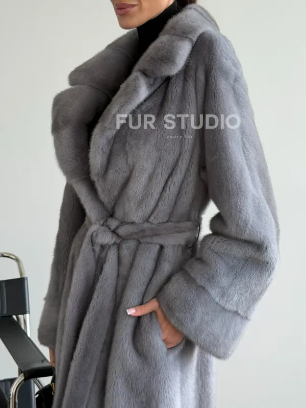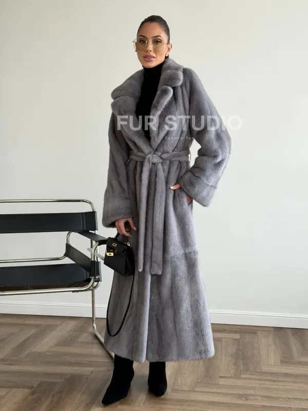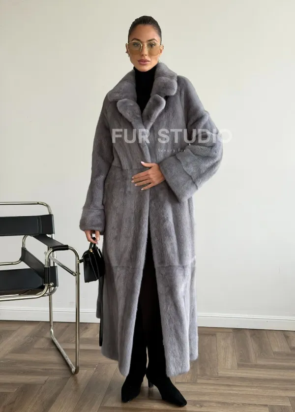 Мех данной шубы аукционная норка, цвет голубой. Предлагается в размерах от 42 до 50. Длина модели 120-125 см, что выгодно подчеркивает фигуру девушек. Эта модель идеально подойдет для девушек и женщин, предпочитающих роскошные натуральные меха.