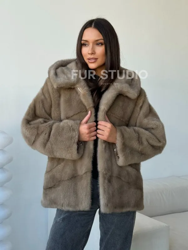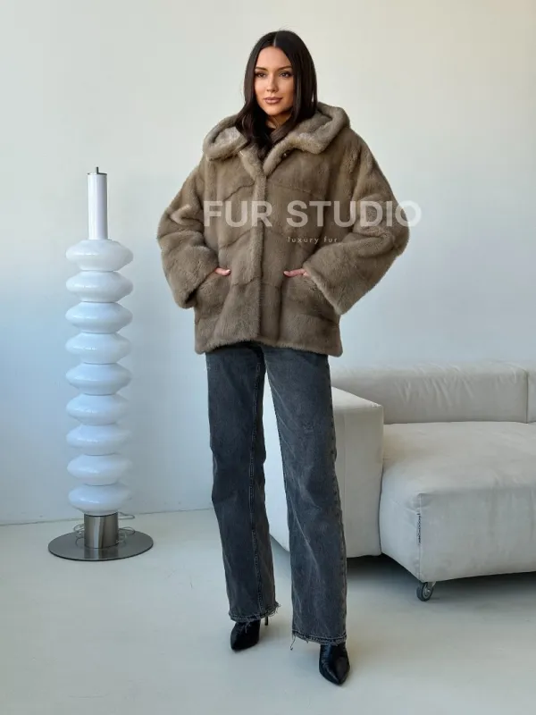 Короткая норковая шуба с капюшоном 102498