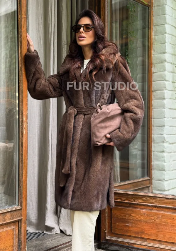 Мех данной шубы аукционная норка, цвет коричневый. Предлагается в размерах от 42 до 48. Длина модели 95-100 см, что выгодно подчеркивает фигуру девушек. Эта модель идеально подойдет для девушек и женщин, предпочитающих роскошные натуральные меха.