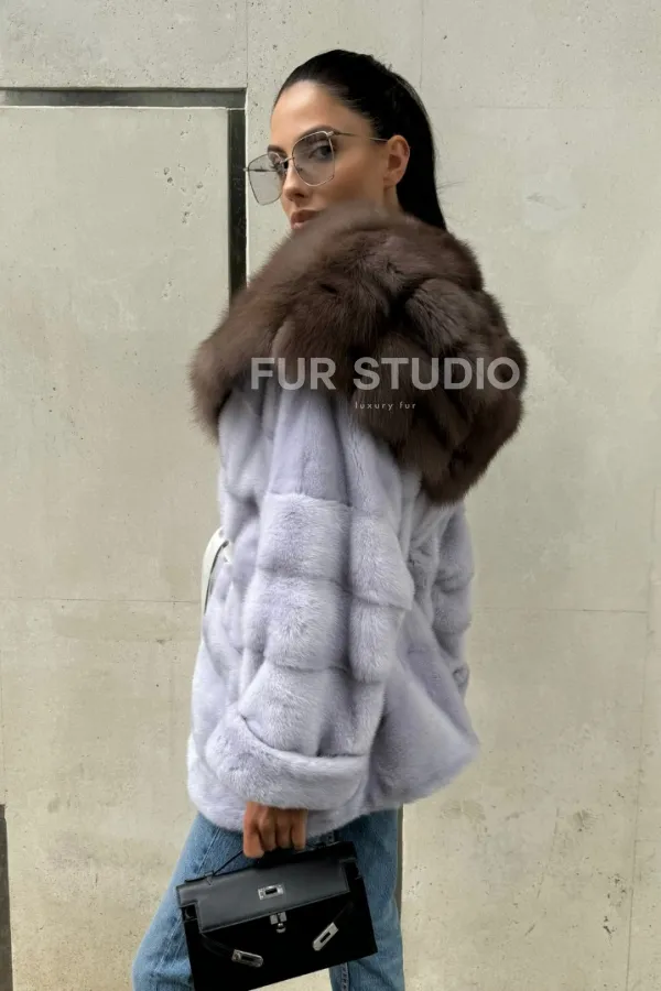 Шуба норковая с капюшоном из меха куницы - цвет голубой 100905