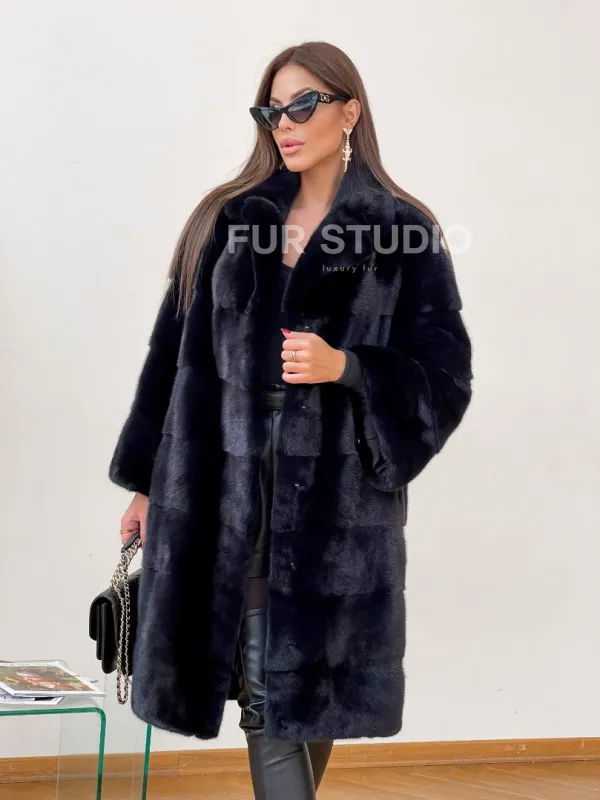Мех данной шубы аукционная норка , цвет синий. Предлагается в размерах от 48 до 50. Длина модели 95-100 см, что выгодно подчеркивает фигуру девушек. Эта модель идеально подойдет для девушек и женщин, предпочитающих роскошные натуральные меха.