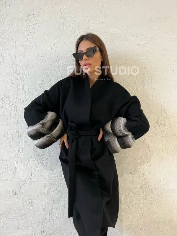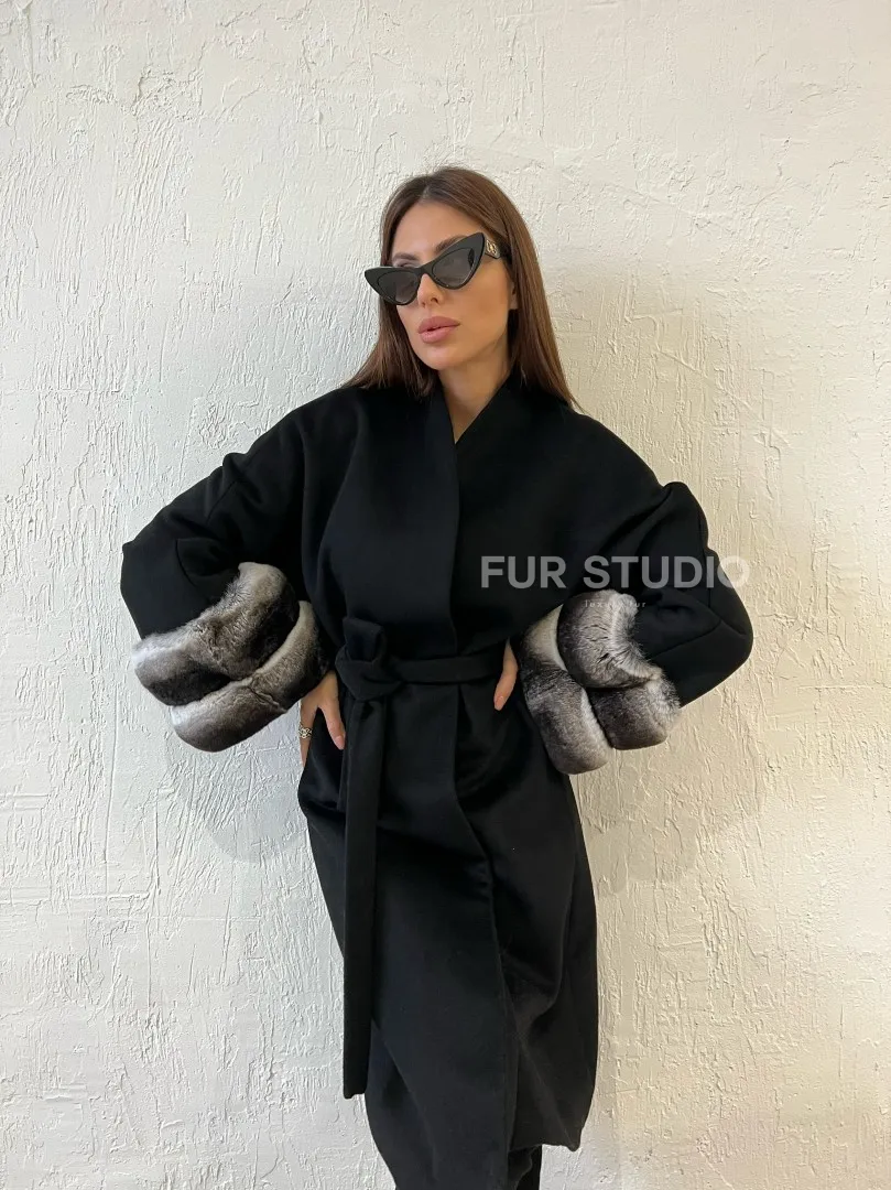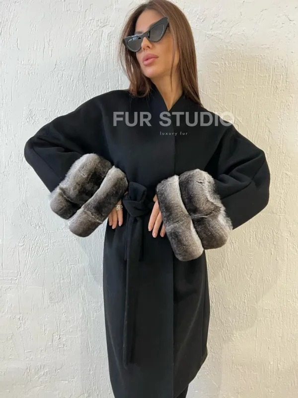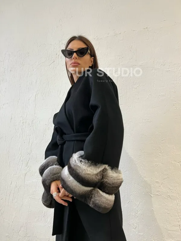 Пальто с мехом шиншиллы - цвет черный 100363