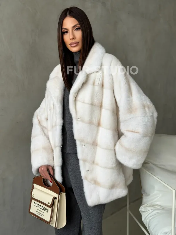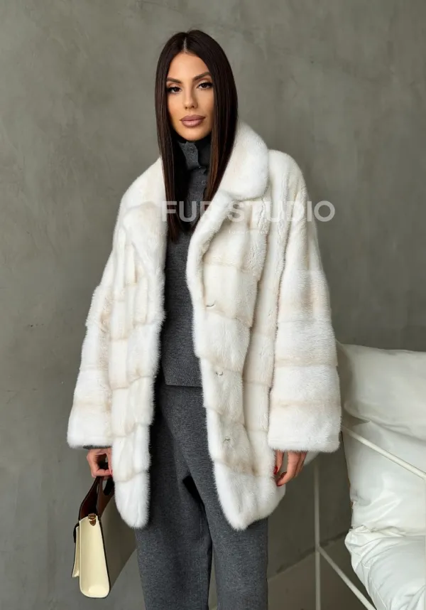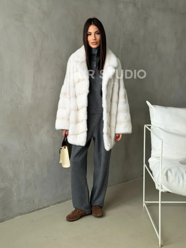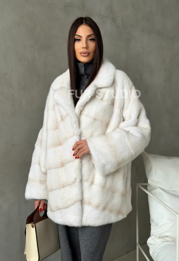 Мех данной шубы аукционная норка, цвет белый. Предлагается в размерах от 42 до 50. Длина модели 70-75 см, что выгодно подчеркивает фигуру девушек. Эта модель идеально подойдет для девушек и женщин, предпочитающих роскошные натуральные меха.
