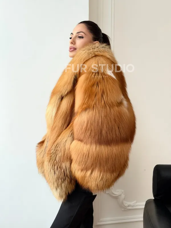 Мех данной шубы лиса, цвет рыжий. Предлагается в размерах от 42 до 50. Длина модели 70-75 см, что выгодно подчеркивает фигуру девушек. Эта модель идеально подойдет для девушек и женщин, предпочитающих роскошные натуральные меха.