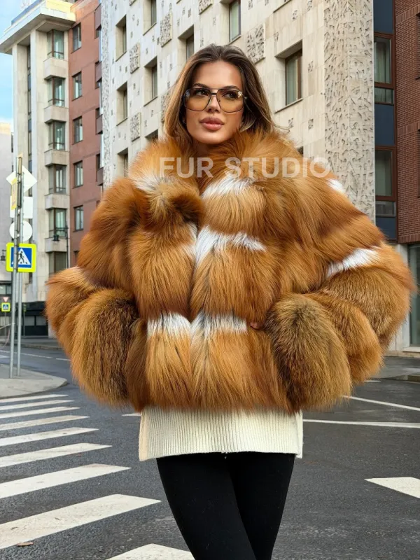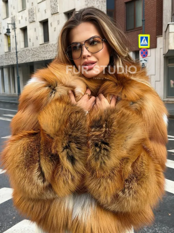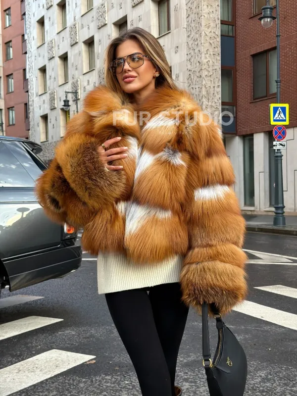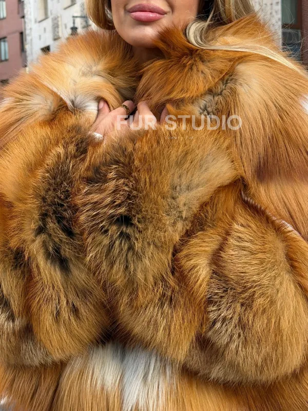 Мех данной шубы лиса, цвет рыжий. Предлагается в размерах от 42 до 46. Длина модели 50-55 см, что выгодно подчеркивает фигуру девушек. Эта модель идеально подойдет для девушек и женщин, предпочитающих роскошные натуральные меха.