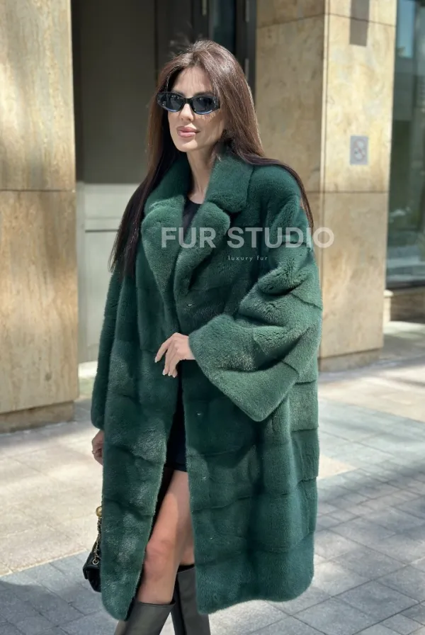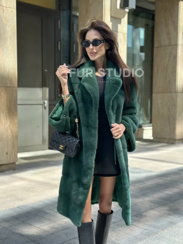 Мех данной шубы аукционная норка , цвет зеленый. Предлагается в размерах от 42 до 52. Длина модели 95-100 см, что выгодно подчеркивает фигуру девушек. Эта модель идеально подойдет для девушек и женщин, предпочитающих роскошные натуральные меха.