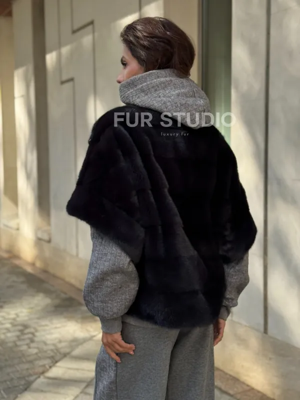 Материал выбранной модели — аукционная норка, доступна в цвете серый. Куртка предлагается в разнообразии размеров, от S до XL, а ее длина составляет 55-60 см, что выигрышно подчеркивает вашу фигуру. Этот вариант идеально подходит для тех, кто ценит роскошь и утонченность натуральных материалов.